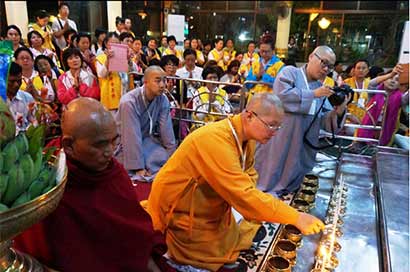 在风动石佛塔、乔达基卧佛、大金塔等圣地,宽如法师带领众弟子通过持诵大悲咒、点灯祈福、念经回向等法事活动,祭奠和超度中国入缅作战的远征军死难烈士亡灵。在仰光大金寺管理处的特别安排下,宽如法师率领众弟子在主塔前的佛殿里举行了庄严殊胜的供灯仪式,以及撞钟、浴佛、绕塔等佛事,并把所有功德回向给中国远征军烈士,愿逝者安息、魂归故里、离苦得乐,得生西方极乐净土,花开见佛共成佛道。同时祈祷世界和平、正法兴盛、天下永康。