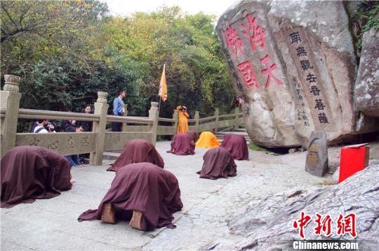 中新网舟山11月12日电(李佳赟林波)11月12日,中国四大佛山之一的浙江普陀山举行“佛顶顶佛”朝拜法会,中国佛教协会副会长、普济禅寺方丈道慈大和尚率领全山各大寺院执事、僧尼、居士及香游客近600人,从法雨禅寺出发,三步一拜行至佛顶山,历时两小时。