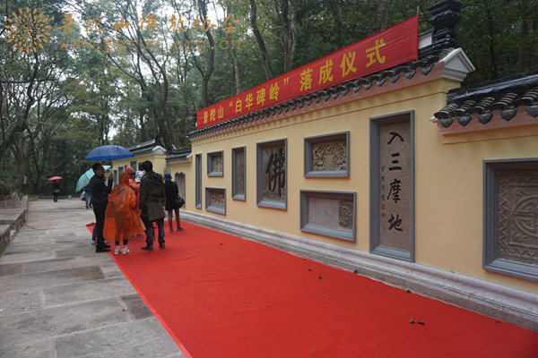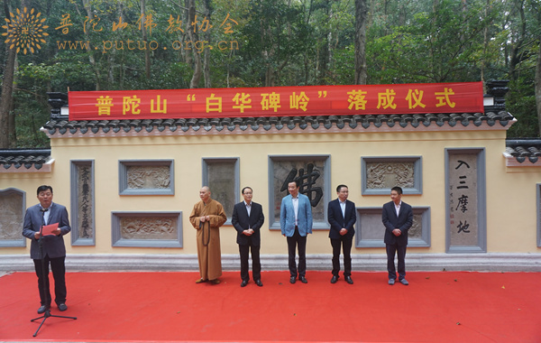 2015年11月12日上午,滴滴细雨、犹如甘露。作为第十三届中国普陀山南海观音文化节系列之一普陀山“白华碑岭”落成仪式在妙庄严路正趣亭旁隆重举行。受中国佛教协会副会长、普陀山佛教协会会长、普济禅寺方丈道慈大和尚委托,普陀山佛教协会副会长定明法师出席并致辞。普陀山管委会主任蒋志伟先生、市文化广电新闻出版局局长陆深海先生、市档案局局长张伟平先生、普陀山管委会副主任顾建斌先生等出席仪式。普陀山管委会副主任丁宏斌先生主持仪式。
