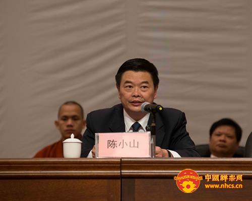 广东省委统战部常务副部长、省民族宗教事务委员会主任陈小山先生发表了讲话,对本次讲经交流会的成功举办表示祝贺。他指出,近年来,在中国佛教协会的倡导引领和大力推动下,广东各地持续开展了讲经交流活动,初步形成了研讨经典、讲经说法的风气,推动了佛教事业的健康发展。在国家宗教局和中国佛教协会的大力支持下,2015中国佛教讲经交流会选择在广东韶关南华禅寺举办,为广东佛教界向全国各地高僧大德学习交流提供了一个很好的平台和契机。陈小山主任对广东佛教的健康发展提出了几点希望:一是要发扬优良传统,坚持爱国爱教;二是要坚持问题导向,积极回应社会关切;三是要从我做起,做到知行合一。并特别建议广东省佛教协会的正、副会长要带头讲经说法,带头做到正信正行,带头坚持以戒为师,以法为依。