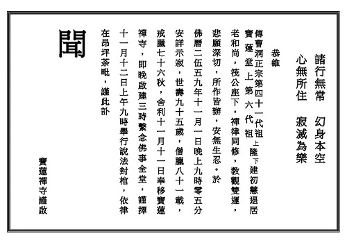 香港宝莲禅寺第六任住持初慧法师,于本月1日晚上9时05分圆寂,世寿九十四岁,僧腊八十载,戒腊七十六秋。宝莲禅寺日前在报章刊登讣闻。法师舍利于11月11日奉移宝莲禅寺,将于当日下午5时进行佛事,至星期四11月12日早上9时举行「说法封棺」,并在昂坪举行火化仪式。