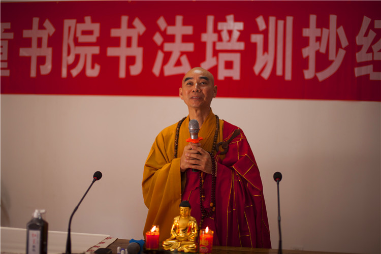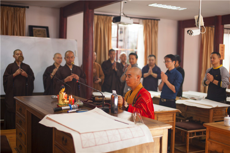 2015年11月7日早上,天童书院书法培训抄经启动仪式在寺院学佛教室举行。浙江省佛教协会副会长、宁波市佛教协会会长、本寺方丈诚信大和尚在学佛班学员的迎请下来到教室,在梵音缭绕的香赞中,为启动仪式拈香祝福。随后又做了精彩的开示,说明了书法艺术和佛教修持的密切关系,特别是抄经的功德不可思议,慈悲地希望学员们能珍惜机会,以虔诚恭敬的心抄写经典,有机融合书法和禅意,提升个人的内在质量。