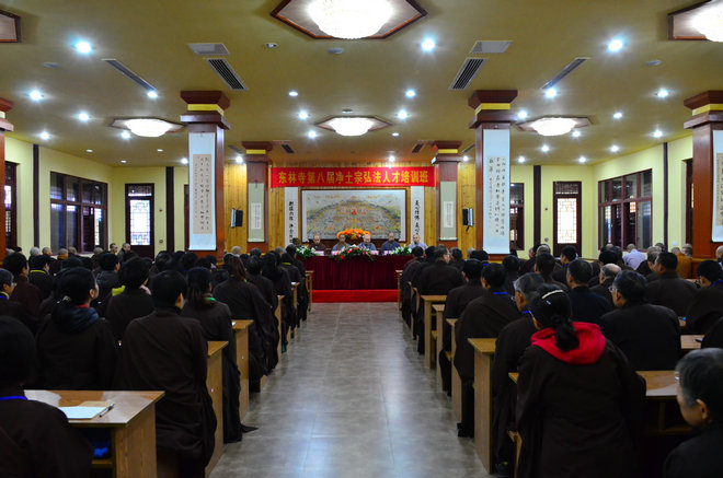 莲池丽景,自春徂秋;净宗真义,传灯千古。2015年11月8日上午,东林寺第八届净土宗弘法人才培训班在香光讲堂二楼举行了隆重的开学典礼。来自全国各地的160余名三宝弟子与东林寺净土宗研习班的40余位面授学员济济一堂,开始了为期半个月的培训班课程。东林寺方丈大安法师在开学典礼上为学员们作了精彩的慈悲开示。