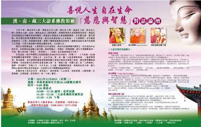 有见及此,故中华佛教文化院特谨订于2015年12月9日(星期三),上午9:30~12:30于葵涌观音讲堂举办“喜悦人生.自在生命”汉、南、藏三大语系佛教领袖──“慈悲与智慧”对话论坛。是次论坛特邀请香港佛教联合会执行副会长宽运大和尚、缅甸佛学国师昂山禅师、青海陀乐寺住持阿旺嘉措金刚上师,本“无缘大慈,同体大悲”的“人间佛教”精神,共同探讨“喜悦人生、自在生命”之主题,传递佛教慈悲、无我的向善力量,让人们的心灵得以增长并坚固起来,以面对生活中种种的迷惑与困厄。