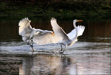 第二天清晨,张厚义早早起了床。当他打开房门,两只大白鸟嚯地从房前的芦苇丛里径直朝他冲来。张厚义惊喜地发现走在前面的正是他日夜思念的飞飞。见到张厚义后,飞飞伸长脖子,拍打翅膀,嘴里不停地“咯咔咯咔”鸣叫,张厚义不禁热泪纵横,不停地抚摸着飞飞的脖子,诉说着久别的思念。亲热够了后,张厚义注意到飞飞身后跟着的白鹤。这是一只刚满4岁的雌性白鹤。它通体雪白,喙和脚像火一样红亮,亭亭玉立,就像是一名青春美少女。张厚义对着飞飞连连夸奖道:“真有出息。”
