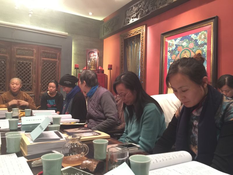 11日28日周六下午两点,在定慧法师带领下,二十几位佛子聚集在碧露轩茶艺馆亚运村店唐卡馆,大家一起诵读佛经。这是响应大众阅藏倡导中心的号召,发起的一次线下实地阅藏活动,参与的都是普通的居士,他们发心阅藏,系统全面地阅读佛陀言教,正闻熏习,打下如法修行的坚实基础。他们平时在家读经自修,每周六下午两点在茶艺馆唐卡馆一起诵读佛经共修。本次参与阅藏共修的居士有87版《红楼梦》妙玉的扮演者姬玉居士、唐卡电影总策划和唐卡公益基金创始人代英居士等。这些热心传播佛教文化的电影人,深感只有真正读经阅藏,知见正确,才有可能创作出宣传佛教文化的艺术精品。