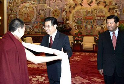 2005年2月3日,胡锦涛主席在人民大会堂接受班禅的拜见。