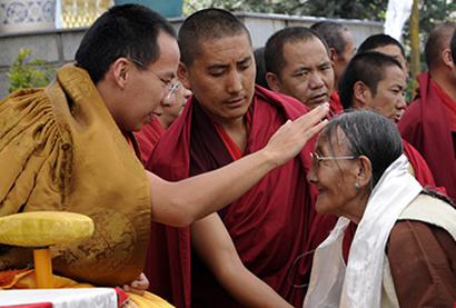 2012年8月6日,班禅为一名老妪摸顶赐福。