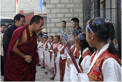 2012年7月,班禅在拉萨彩泉福利特殊学校慰问孤残儿童。