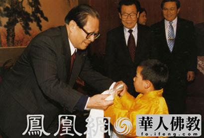 1996年1月12日,江泽民主席在中南海接受班禅和扎什伦布寺致谢团的拜见,班禅向江泽民主席敬献哈达。(图片来源:凤凰佛教)