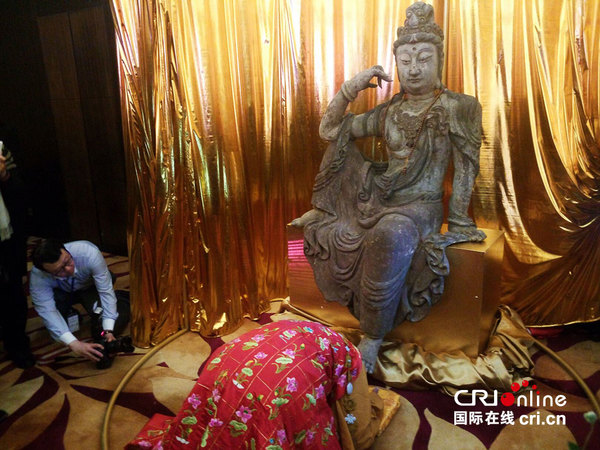 国际在线报道(记者邓晨曦):12月12日,泰王国驻华大使馆、泰王国文化部、泰国佛教造像与文物协会、山西五台山东台望海寺等单位在北京召开新闻发布会,宣布泰国佛教造像与文物协会常务副会长龙戴先生将一尊唐代木质自在观音菩萨雕像交予泰国佛教造像与文物协会,由协会代表泰国官方与民间无偿捐赠给中国山西五台山东台望海寺,让这尊经历了战火洗礼,辗转国外的自在观音菩萨雕像带着泰国人民的友谊回归祖国,福泽四方。