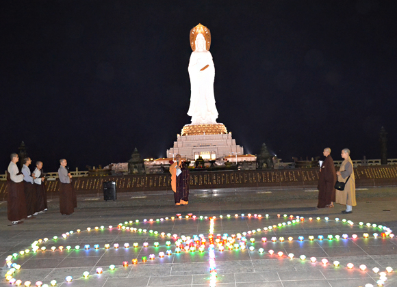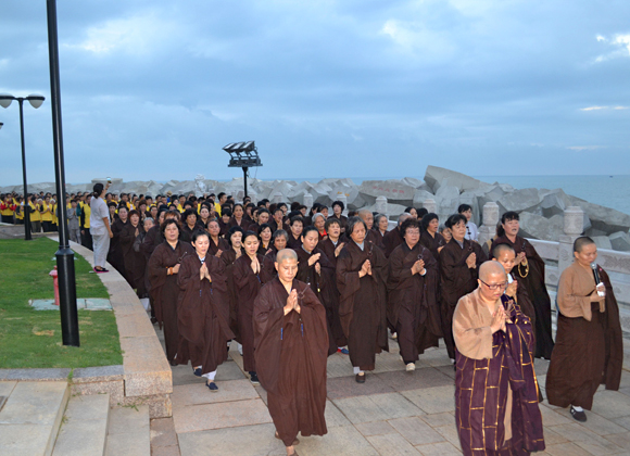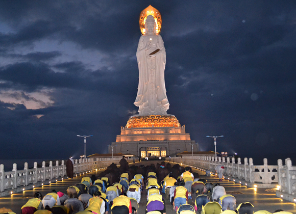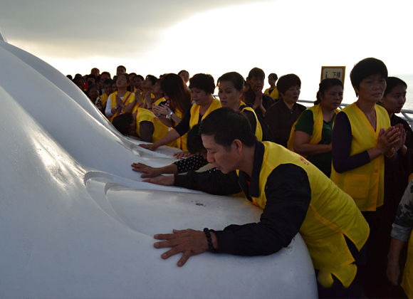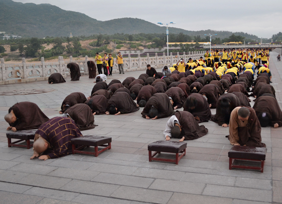 10日凌晨6时,观音菩萨慈悲庄严的俯瞰着众生。在泰华庵主持的带领下,僧众团边念诵忏悔文边三步一拜观音菩萨,放眼望去,海天相间,万籁皆静,只剩下一行让人感动的信徒。