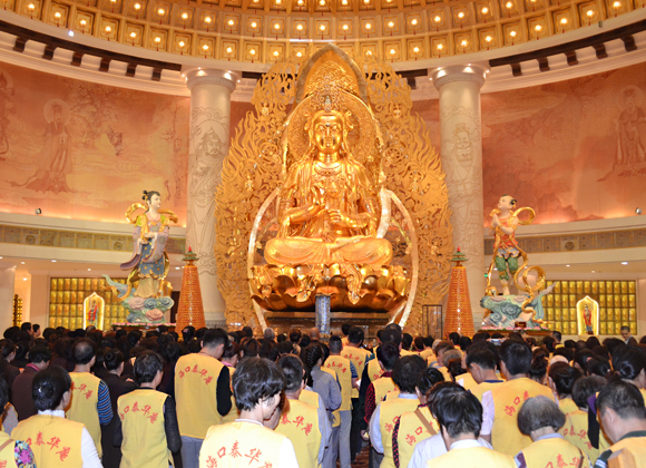 到达观音岛进行殊胜的绕佛仪式后,进入圆通宝殿礼拜圣观音,如法诵持普门品祈福,并将此功德回向十方法界众生。