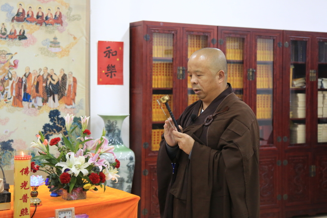 上午约八点一刻,居士们身着法服,于学会楼一楼会议室,整齐排班。大众在维那师引领下唱诵“南无本师释迦牟尼佛”,静候大安大和尚。