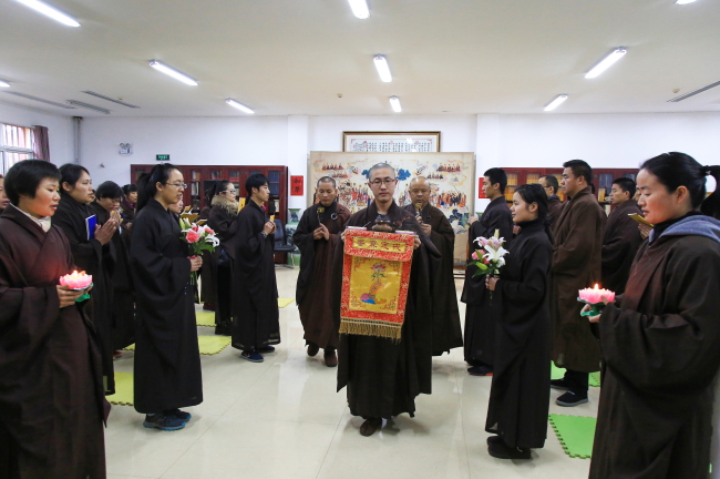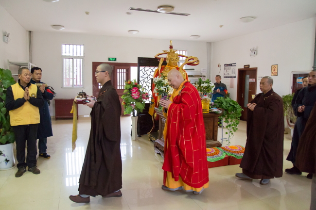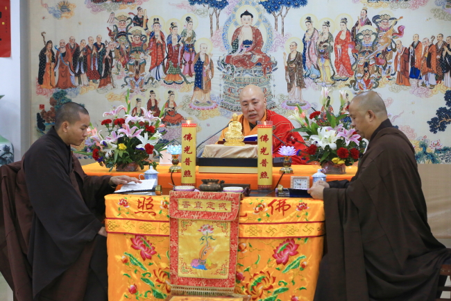 约八点半,在引礼师带领下,居士代表持香花,于客堂内恭请永明堂上大下安和尚,祈授净法。大和尚欣然入场,拈香礼佛后,上座为大众说法开导。