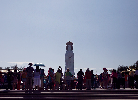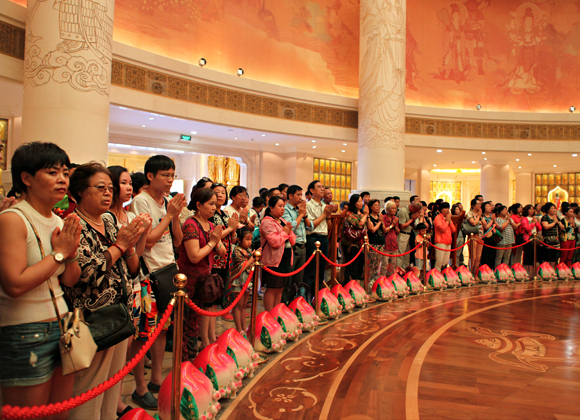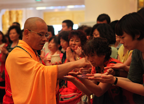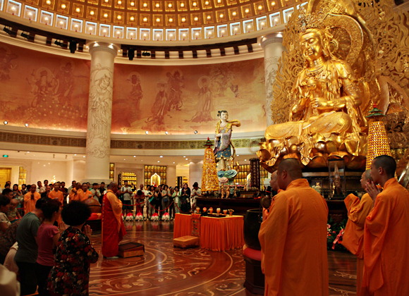 2015年12月11日农历十一月初一,梵天碧海,惠风和畅,海上观音道场迎来十方善信前来上香祈福。当天上午在圆通宝殿内于吉时举行上供祈福法会,南山寺僧众、居士、善信及游客约四百余人共沾法喜。