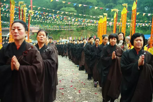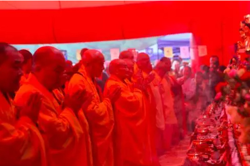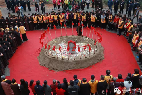 一如长老宣说洒净法语,护法善信虔诚礼拜,梵音唱响,诵经祈福。一如长老、绍云长老、禅道长老等十五位主法法师手持杨枝净水,绕场一周分别洒净加持。杨枝净水,遍洒三千,性空八德利人天;福寿广增,灭罪消愆,火焰化红莲。此时,蒙蒙天雨也戛然而止,大王山头祥云萦绕,不经意间示现着神奇,预示着古老的普光禅寺即将迎来新的时代面貌,重新担负弘法度众的使命。