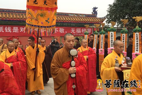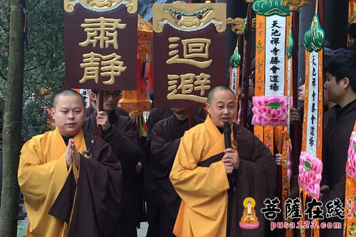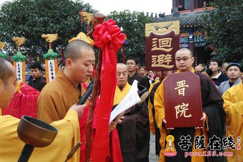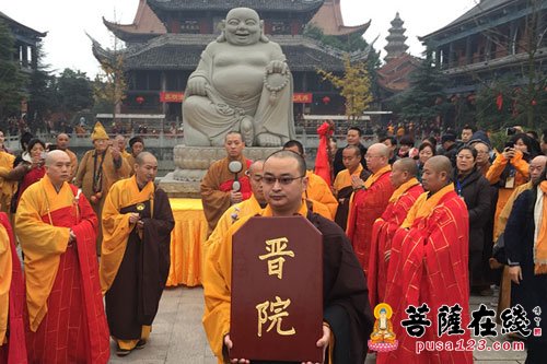 今逢盛世,党政英明,上午9时30分,依照住持晋院仪轨,天池禅寺钟鼓齐鸣、梵音高唱,天池禅寺监院、执事代表及两序大众、十方善信恭请果明法师晋院。