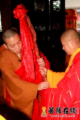 四川省自贡市佛教协会会长、妙观寺住持法音法师为果明法师授柱杖