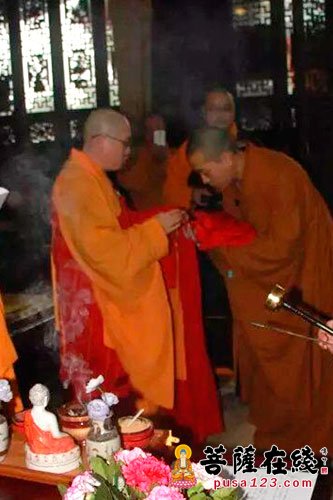 四川省佛教协会副秘书长、泸州方山云峰寺方丈智果法师为果明法师授祖衣
