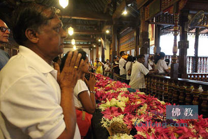 当地时间上午10:30左右,巡礼团在菩提寺住持善法长老的陪同下瞻仰佛牙舍利。据记载,释迦牟尼佛的佛牙舍利只有两颗流传人间,其中一颗珍藏在北京西山八大处的佛牙塔内,另一颗就供奉在康提的佛牙寺中。