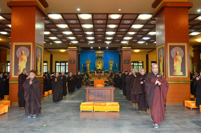 12月10日午时,阴雨甫歇,晴光照抚的东林道场格外庄严清净。1时30分,由东林寺方丈大安法师主法,本次法会在大雄宝殿举行了隆重的洒净仪式。大安法师带领众法师在大雄宝殿、香光讲堂、老念佛堂、五观堂等处进行了洒净。在悦众师带领下,四众弟子在大雄宝殿、香光讲堂、老念佛堂等会场齐声唱诵《炉香赞》、《净水赞》、《大悲咒》、《摩诃般若波罗蜜多心经》等经咒。