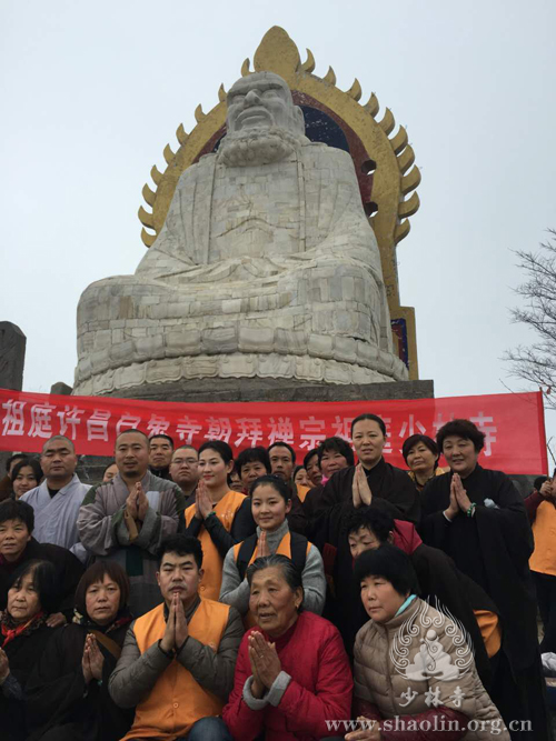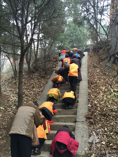 在与永信方丈欢喜合影后,“风中菩提”朝圣团从少林寺山门出发,三步一拜,冒着冬日的严寒,先后朝礼初祖庵、达摩洞,直至达摩祖师巨像前,欢喜留影。