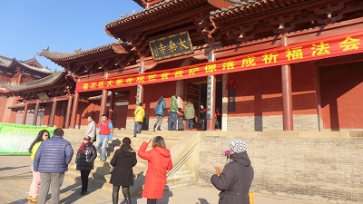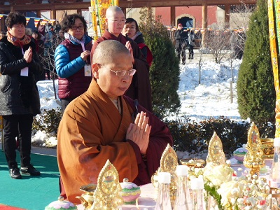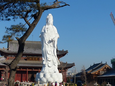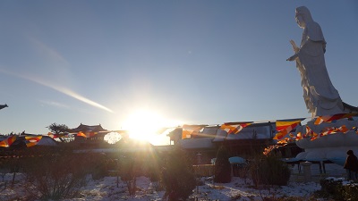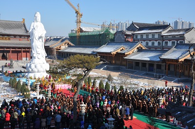 昨日还是雪花迎风飞舞,今晨大乘寺的天空就变得湛蓝湛蓝。时值2015年11月26日感恩节,一尊汉白玉的观世音菩萨像巍巍站立在寺院的中央,人们扶老携幼一家一家地来到大乘寺参加观世音菩萨像的落成法会。真是应了我们中国那句老话:“家家弥陀佛,户户观世音。”观世音菩萨累生累劫,以大慈大悲的情怀悯念众生,和这一方的父老乡亲结下了深厚的因缘。虽然,天气清冷,但是无法阻挡人们对于慈悲情怀的渴望。