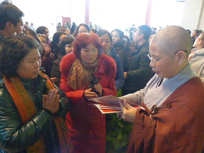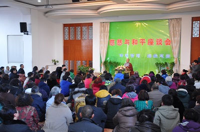 午斋后,师父上人应众人之请,与大家畅谈“慈悲与和平”。世界和平有赖于国家安定,国家的安定有赖于家庭的和睦,家庭和睦离不开通过修行来达到心平气和。大家从如何念佛到如何培育后代,逐一地向师父请教着生活与工作中的困惑烦恼。师父上人时而风趣幽默,时而严谨活泼,将如何智慧地来面对生活,如何将心量打开、慈爱接纳一切等佛法的道理,深入浅出地告诉了人们。开心的笑声,由衷的掌声阵阵响起。