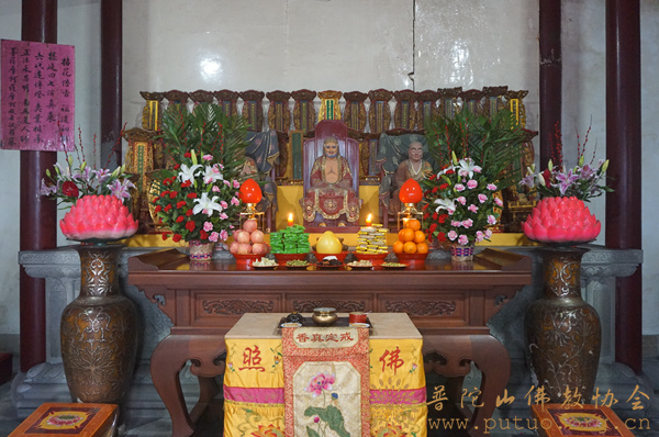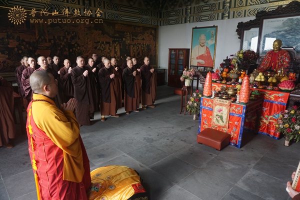 上午9时,受普陀山佛教协会会长、普济禅寺方丈道慈大和尚委托,普济禅寺副监院悟根法师携两序大众分别于祖师堂、净土堂、妙善老和尚纪念堂,普同塔、一山一宁纪念塔等历代祖师灵塔前供佛奉祖,感恩追思。大众师虔心念佛诵经,礼敬先贤。