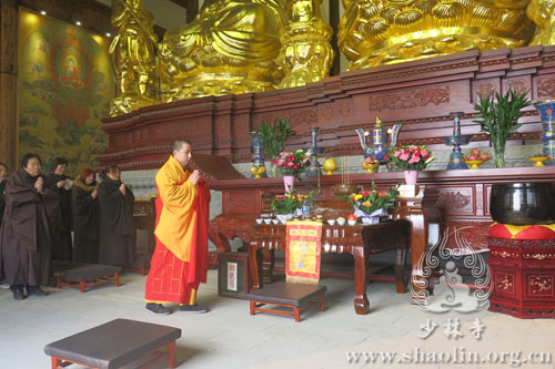 祈福上供法会上,盘山北少林寺监院延沛法师拈香主法,大家一起诵经祈福,祈愿新落成的北少林寺今后能够恩泽一方,为弘扬佛法、传播正知正信及少林文化做出贡献。随后,殿内还举行了庄严的上供法会,祈愿国泰民安,风调雨顺。(供稿:延万法师 责编:佛心)