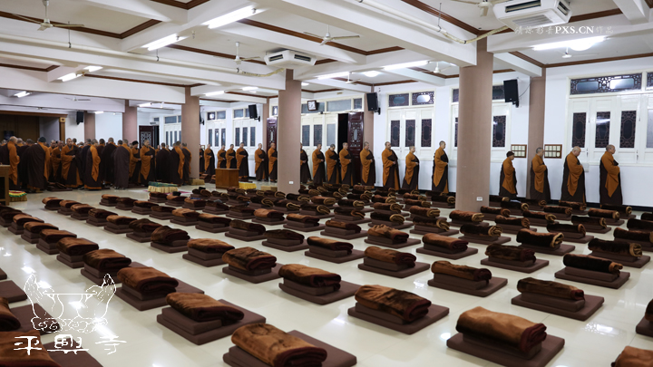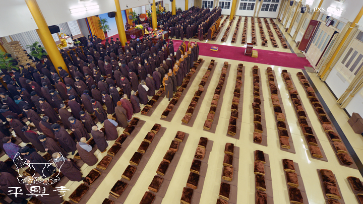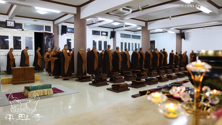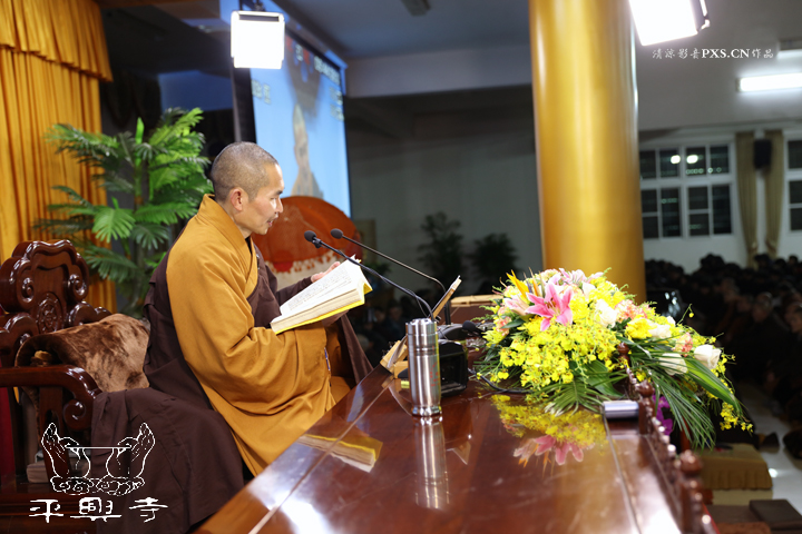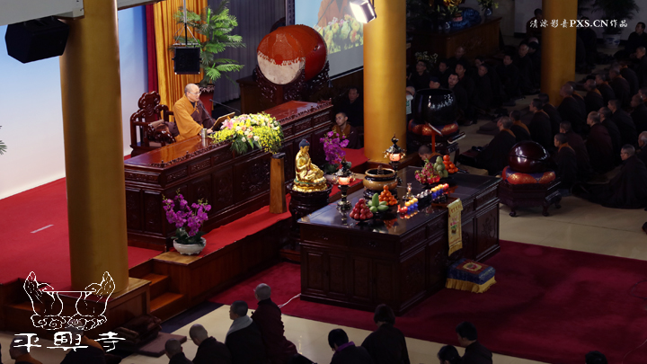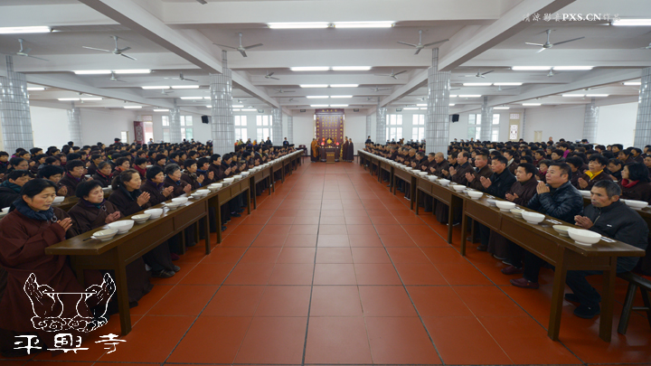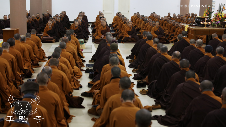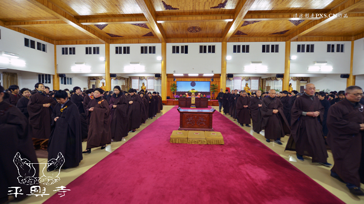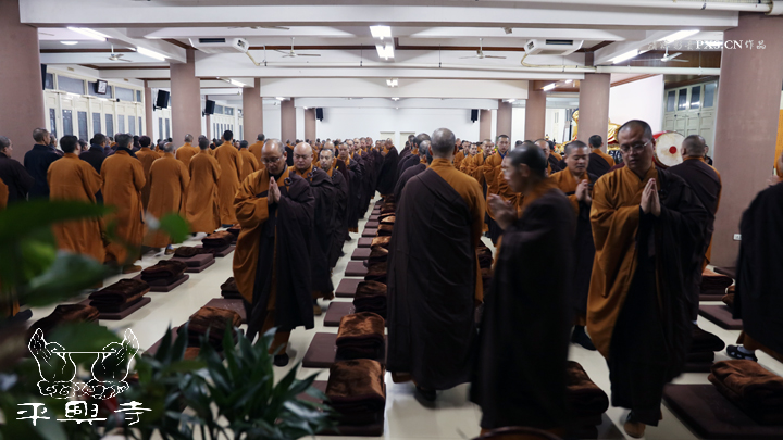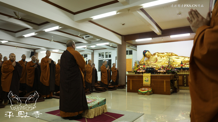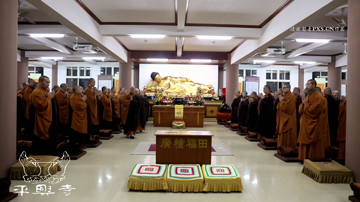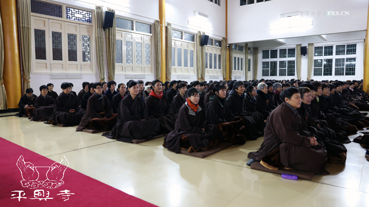 二零一五年农历十一月初八晚上五点四十分,平兴寺常住冬季佛七于卧佛殿正式起七。是日晚五点四十分,平兴寺常住三百多师父们集于卧佛殿,由界诠法师拈香主七,大众一起唱莲池赞、赞佛偈、诵《阿弥陀经》,念佛、绕佛,佛七正式开始。
