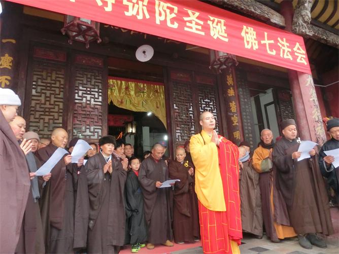 下午两点法会开始。住持宽容大和尚解七开示:这次打佛七非常圆满。此前十几天断续凄风冷雨,佛七开始后晴天就多起来,近几天更是暖如小阳春,连每年农历十二月才开的院中腊梅昨天竟含苞欲放,人天护法,殊胜难得。今年参加佛七的人数大幅增长,平日数百、多时达千人,蔚为大观,尤其可喜的是中青年信佛的比例提高了,26日传授三皈五戒,原计划在上院的客堂举行,因求皈求戒的人十分踊跃,客堂的空间远远不够,临时改到大雄宝殿。这说明在建设和谐社会的时代潮流中佛法越来越被大众认识,佛教的积极作用越来越明显。宽容大和尚勉励大家精进念佛,三宝加被,极乐世界就在当下。