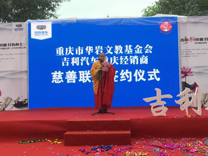 重庆市华岩文教基金理事长、华岩寺方丈道坚大和尚委托重庆华岩寺监院、重庆市华岩文教基金会副理事长隆证法师到场致辞祝贺并赠送道坚大和尚墨宝“大吉大利”。重庆市华岩文教基金会秘书长尹亮与浙江吉利控股集团汽车销售有限公司重庆大区经理李宇剑在合作协议上签字。