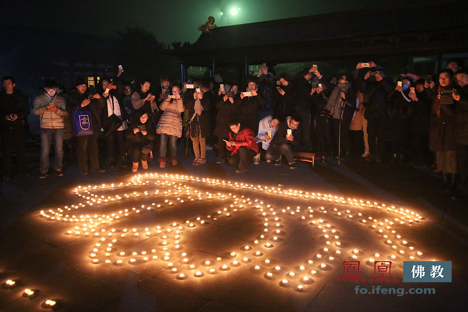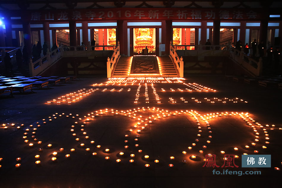 凤凰佛教唐山讯 围绕着近4000盏摇曳烛灯组成的祈福图案,2015年12月31日晚,唐山市龙泉寺的10余位僧人带领数百名佛教信众为世界祈福,为中国祝祷,祝福2016国泰民安,风调雨顺,并祈愿在1976年唐山大地震中罹难的24万同胞往生极乐。
