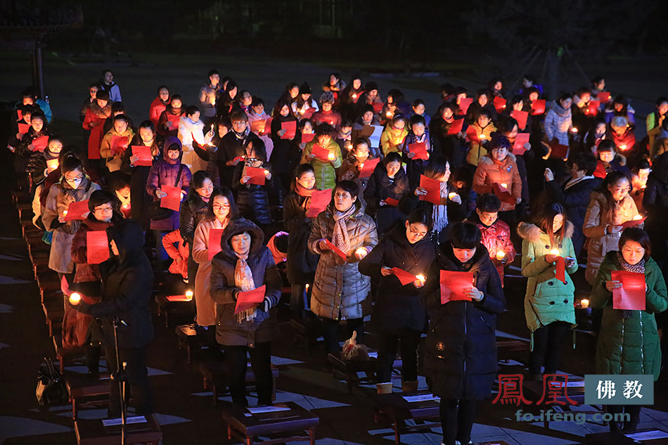 2016年新年祈福功德法会是龙泉寺2016年开光庆典的系列预热活动之一。在当晚6点半开始的传灯祈福法会上,数百信众手持龙泉寺免费结缘的平安吉祥灯,以“一灯能破千年暗,一智能灭万年愚”的佛教供灯传统,围绕着龙泉寺大雄宝殿广场,虔诚称念药师佛号,并一齐读诵《传灯祈愿文》,将美好的新年祝愿传递给一切有情。