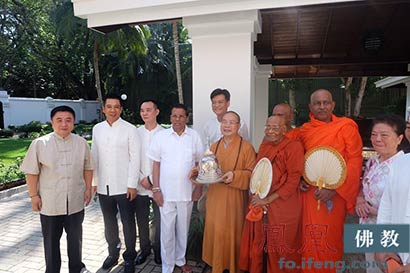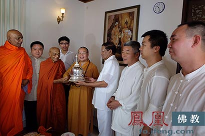 僧王将12月8日上午举行迎请仪式的佛陀舍利交由总统,并由总统亲自交与耀智大和尚带回中国广州大佛寺供奉。(图片来源:凤凰佛教)