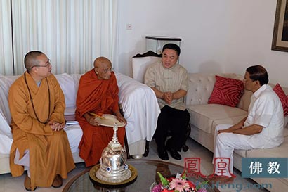 耀智大和尚在僧王陪同下赴总统官邸拜访现任斯里兰卡总统麦德利巴勒-西里塞那先生(图片来源:凤凰佛教)