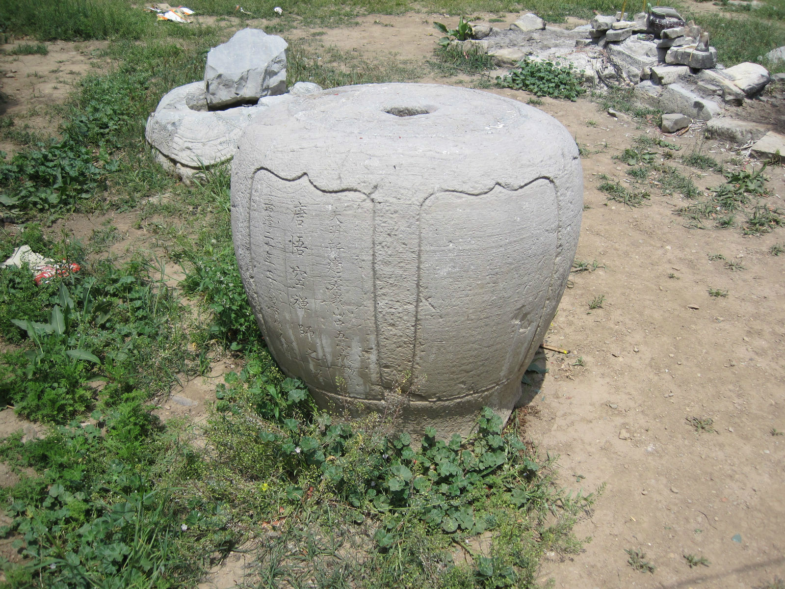 遗址上耸立的砖石塔一直被误认为是悟空瘗骨塔,其实它的建造年代要晚的多。遗址搁放的“石墩”才是悟空墓塔的残存,是一件喇嘛式塔的覆钵部分,明代最为常见的墓塔形制。