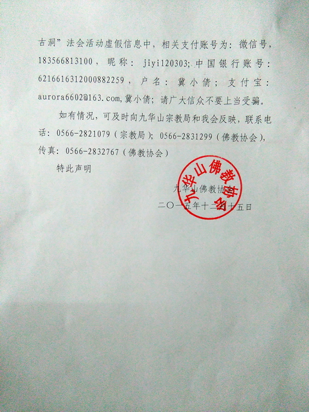 如有情况,可及时向九华山宗教局和我会反映,联系电话:0566-2821079(宗教局);0566-2831299(佛教协会),传真:0566-2832767(佛教协会)