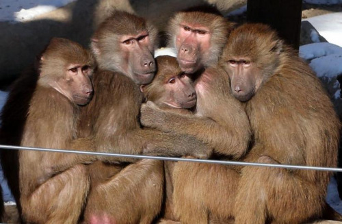 据报道,由于寺庙里的猴子多达3000只,一些猴子无法靠近火堆,它们只好三三两两的抱在一起取暖,看起来十分惹人怜爱。