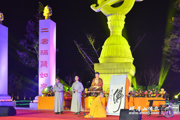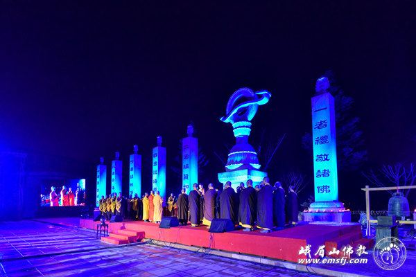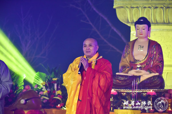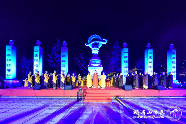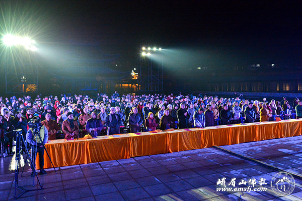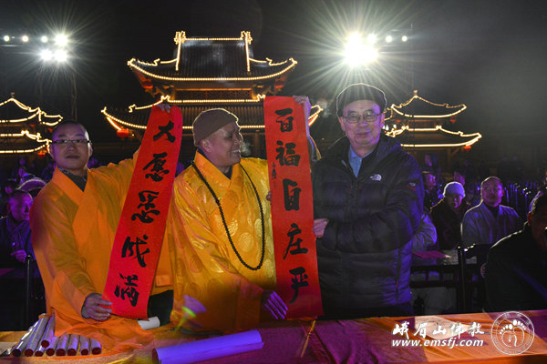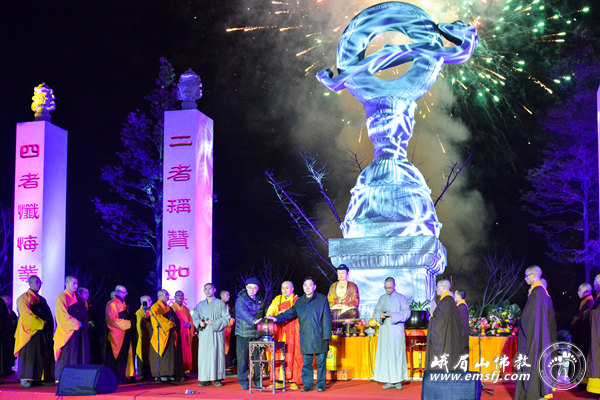 2016年元月23日晚七时,在猴年新年即将来临之际,漫天飞舞的大雪暂时停止了飘扬,峨眉山佛教协会“灵猴迎新春、行愿祈福吉祥灯会”开灯仪式在新落成的大佛禅院行愿广场举行。四川省人大民宗委主任王增建、峨眉山佛教协会会长永寿大和尚、中国科学院院士朱清时以及法师、佛教善信弟子近300人共赴盛会,同沾法喜。