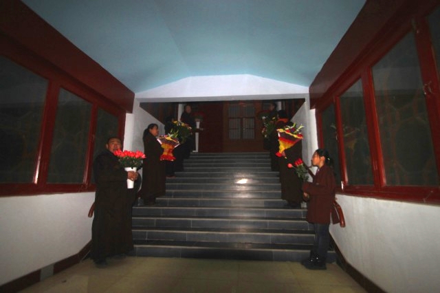 信众手持鲜花,列队两旁,迎请大和尚出关