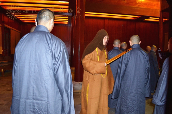为了禅七准备更加充分,禅堂僧众首先做了三日“预演”,佛协副会长、法雨禅寺监院信光法师多次召开执事会议筹备禅七相关事宜并表堂警策大众禅七规矩。初八日下午五点三十分,当值师父三阵叫香,全寺执事和禅堂师父在佛龛前分班站立,等候传牌。侍者捧“起七”牌进堂示众并交予维那师,维那师将“起七”牌交给香灯师,接放佛龛东侧,后挂禅堂门口。接着迎请主七法师入堂,在维那心慧法师的带领下,举行了隆重的“起七”仪式,并分别授予监香香板。道慈大和尚亲临现场监香,领众行香并慈悲开示。法会如法如律,庄严威仪。