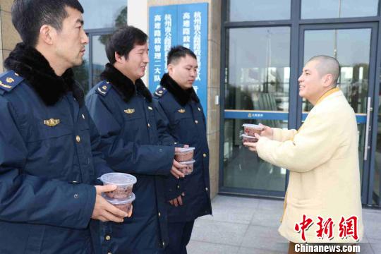 “这是我第一次吃到腊八粥,没想到还是灵隐寺送来的。”浙江杭州绕城高速养护工人邓德洪手捧着腊八粥,开心得有些不知所措。1月14日,浙江杭州千年古刹灵隐寺为浙江杭州绕城高速的路政人员、养护工人送来该寺熬制的腊八粥。
