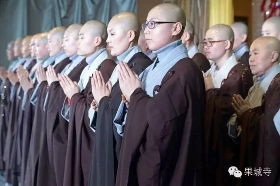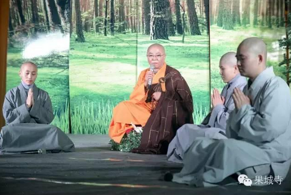 下午1:30,数百名长期以来一直关心和护持果城寺的善信莲友和社会各界人士,齐聚庄严整洁的三圣殿殿堂,有序而坐,翘首等待。
