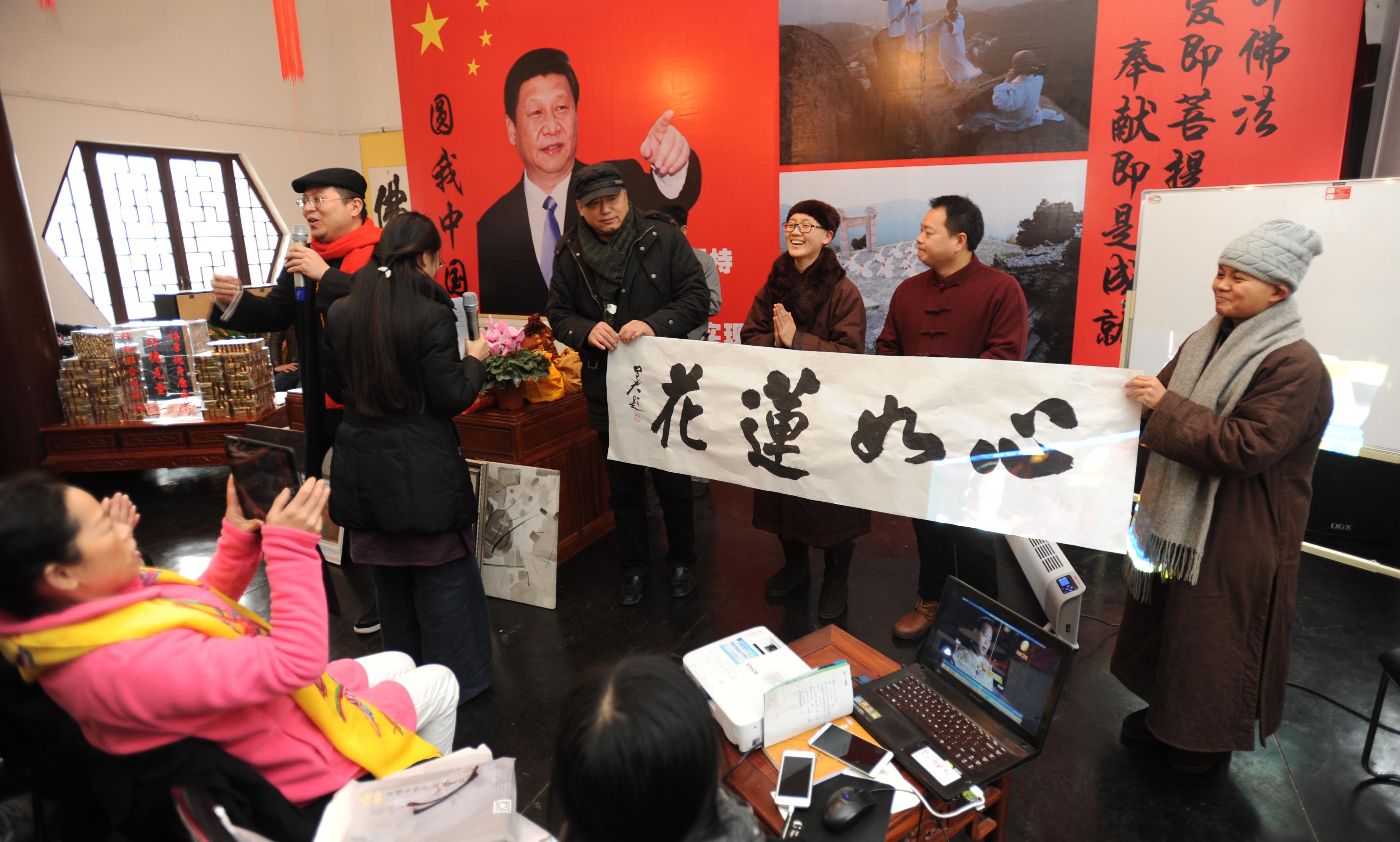 96岁高龄的国宝级画家彭祖华教授为天台寺捐献102幅书画作品,并冒着严寒上山支持。著名书法家、国家电脑字库“雪君体”创作者谭雪君也亲自到现场助阵。雪君表示,他从浙江往返自费“打飞的”参加天台寺的义卖活动,就是因为天台寺的理念与他的价值观相契合。雪君主张“以德为先”,天台寺倡导“以德成佛”。