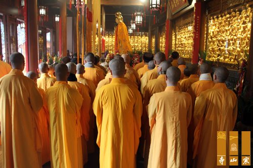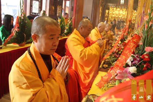 上午9时18分,两序大众恭迎中国佛教协会副秘书长、江苏省佛教协会副会长兼秘书长、寒山寺方丈秋爽大和尚,苏州昆山佛教协会会长、华藏寺方丈秋风大和尚,张家港佛教协会名誉会长,永庆寺方丈秋林大和尚,张家港佛教协会会长,香山寺方丈法禅大和尚,泰州佛教协会会长,光孝寺方丈法空大和尚共同主法法会,寒山寺两序大众及寒山书院学僧在罗汉堂分列两侧。