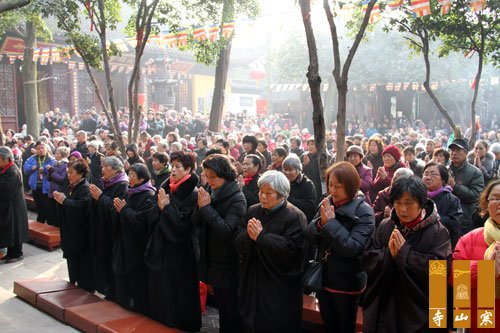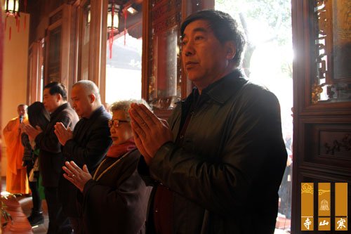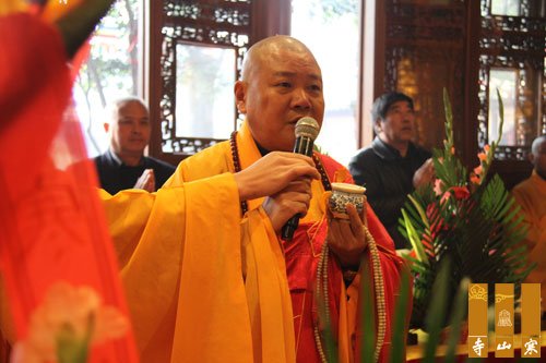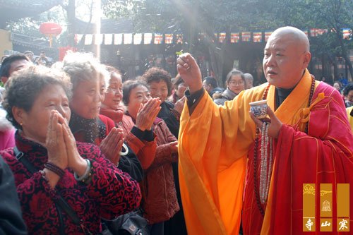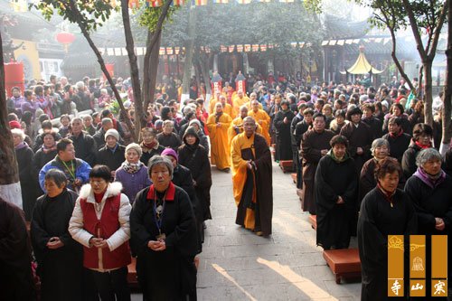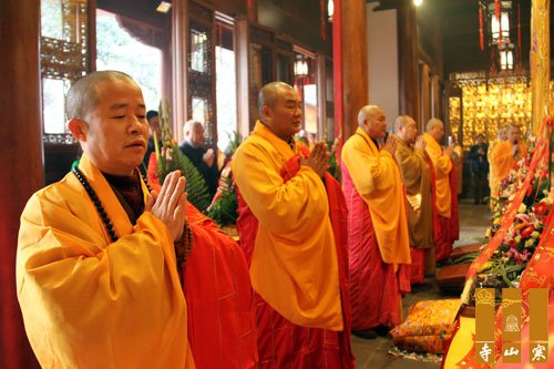 《炉香赞》起,诸位主法法师拈香礼佛。大众齐颂《心经》、《大悲咒》,秋爽大和尚、秋风大和尚、秋林大和尚、法禅大和尚、法空大和尚以大悲水为罗汉堂洒净。寒山寺护法居士及善信三百多人随喜参加落成庆典,同沾法喜。