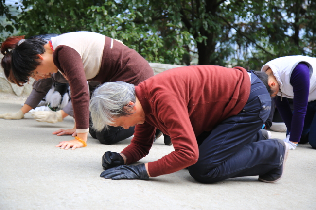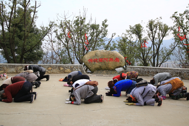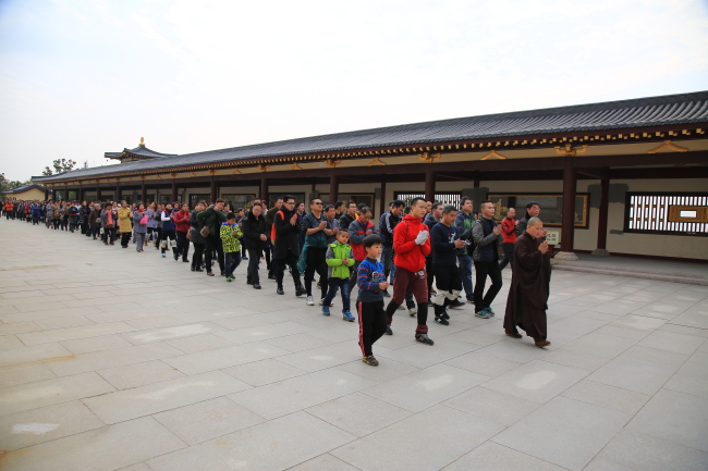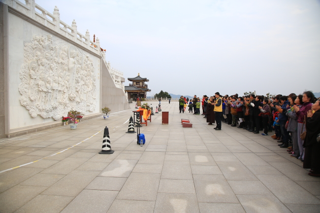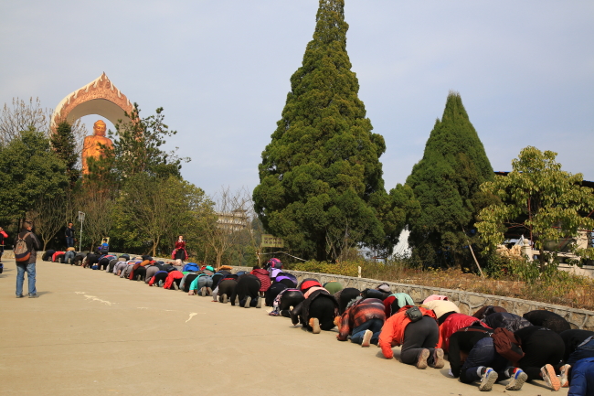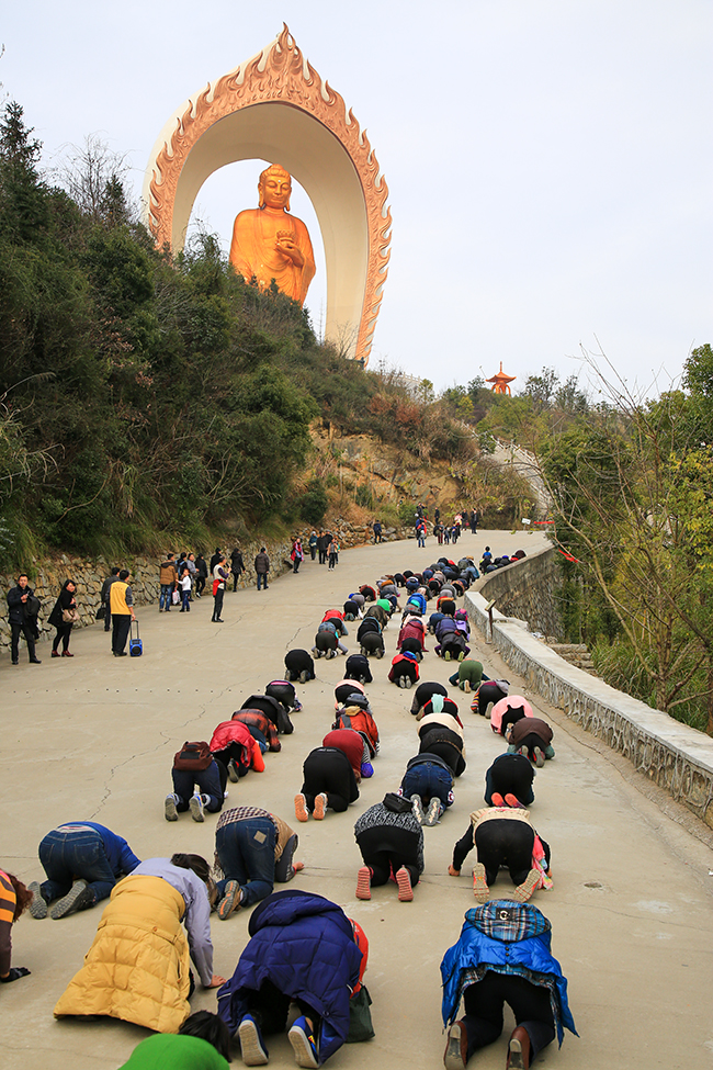 当天中午12点,朝拜团驱车抵达净土苑后,首先在接待中心听取了净土苑义务讲解员对净土苑的介绍,随后排队走上拜佛台。1点20分,朝拜团在拜佛台西侧的山路上重整队形,开始拜佛。一名尼师在前领众,其余人等则按四人为一组前后排列。一时间,蜿蜒山路上便出现了一条壮观的长龙。众人随着佛号声,三步一拜向着阿弥陀佛圣像前进,队伍整齐而又庄严。